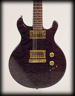 very dark Trans. Blue finish over quilted maple. P&J EMG